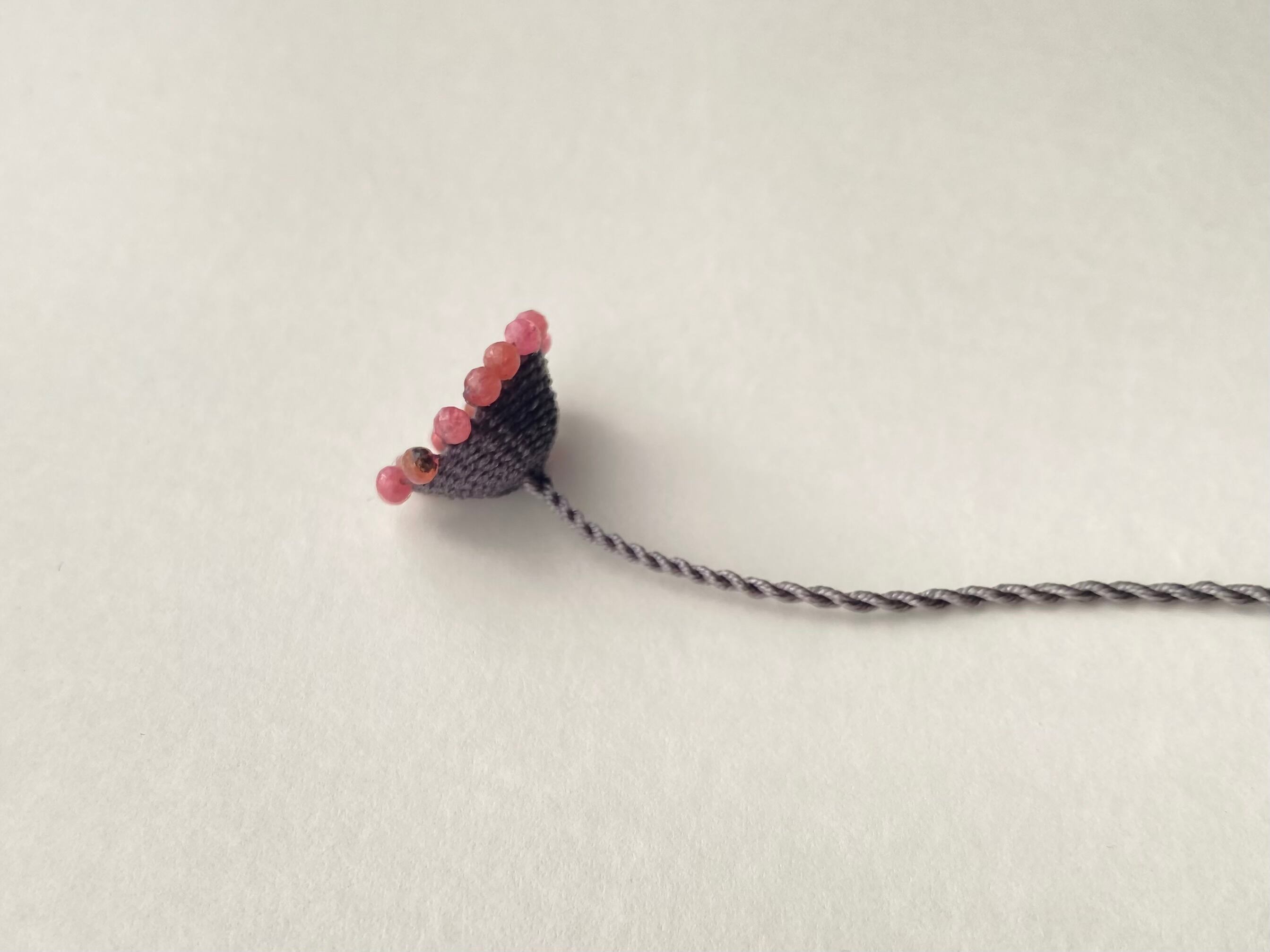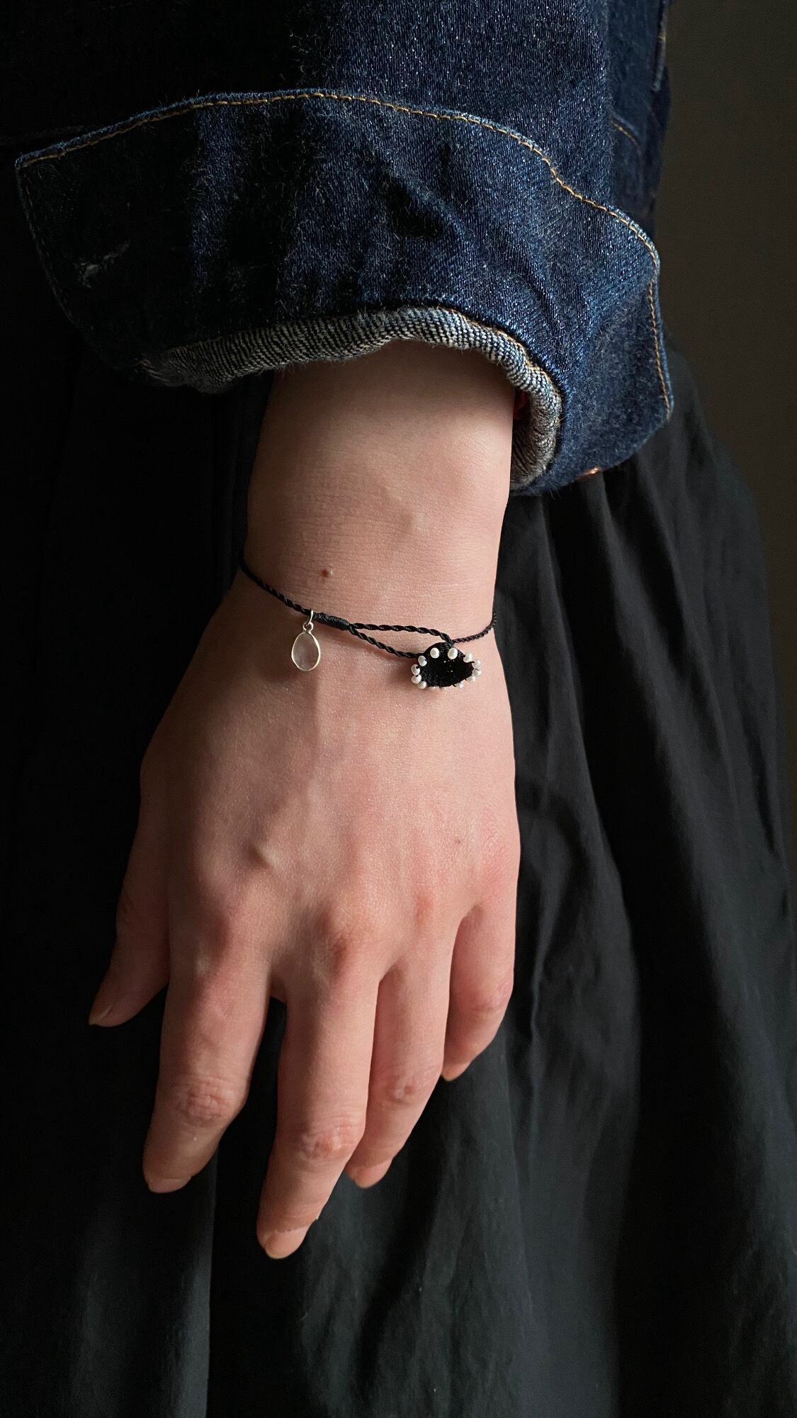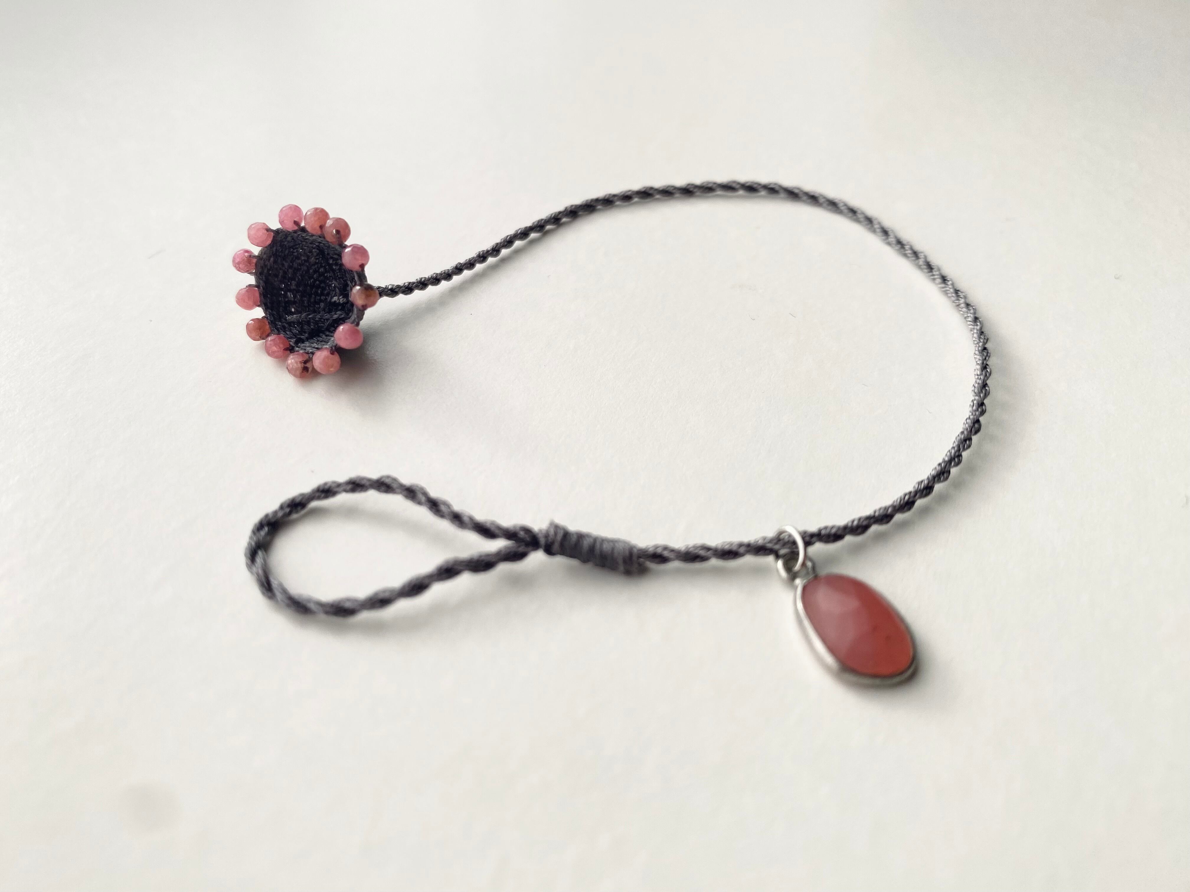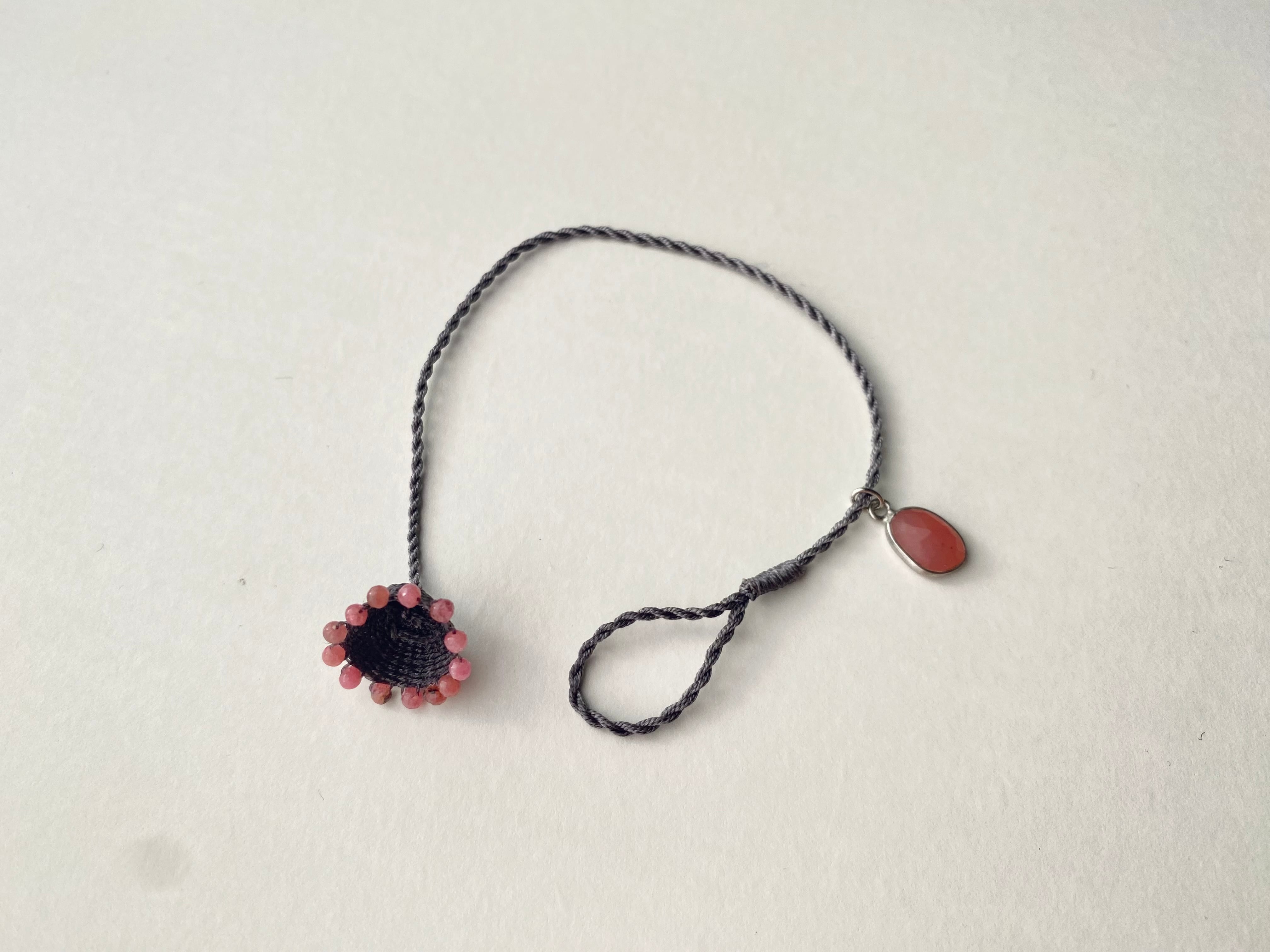 絹糸を使用した華奢なブレスレットは、柔らかなグレーと可愛らしいピンクの組み合わせが、シンプルながらも洗練された印象を与えます。