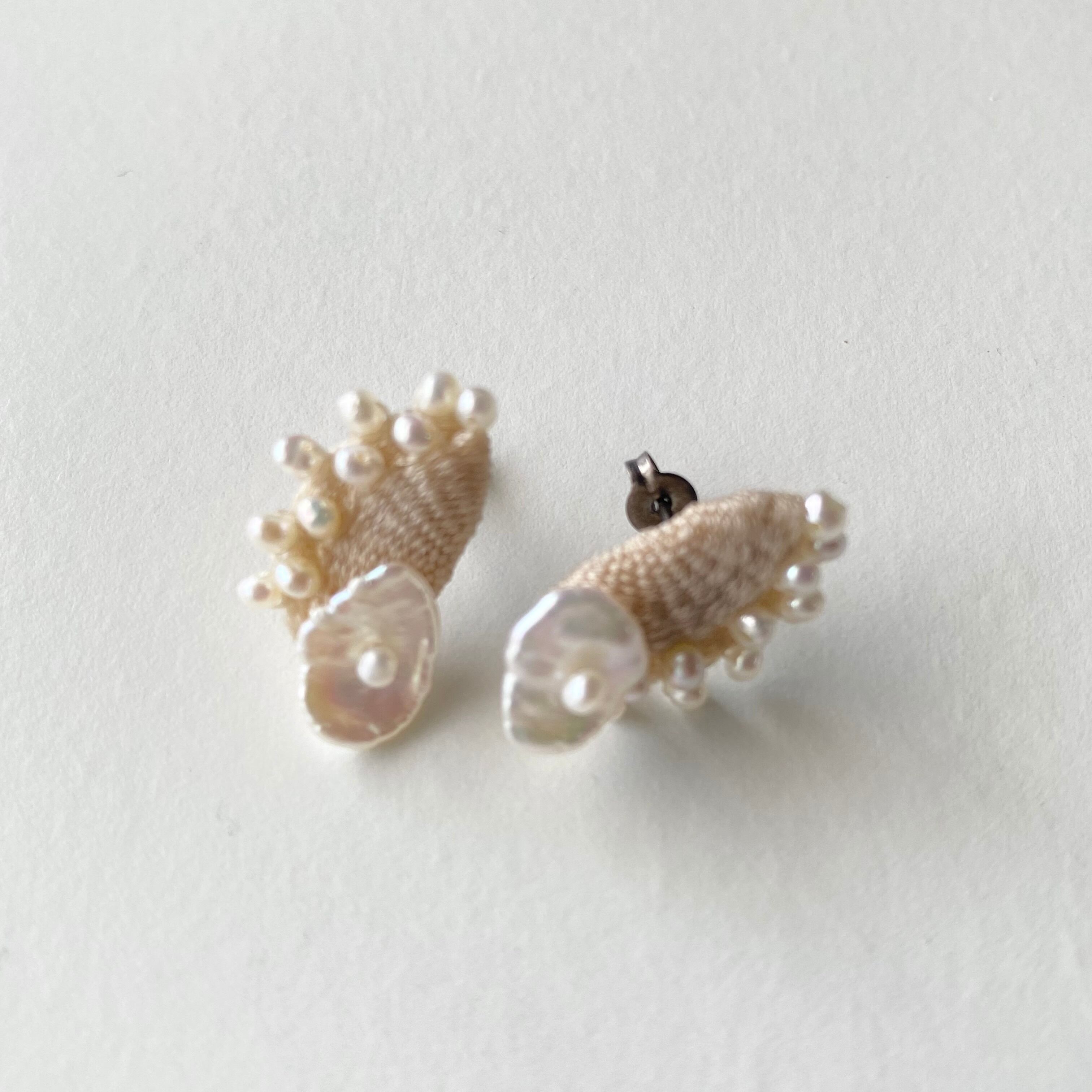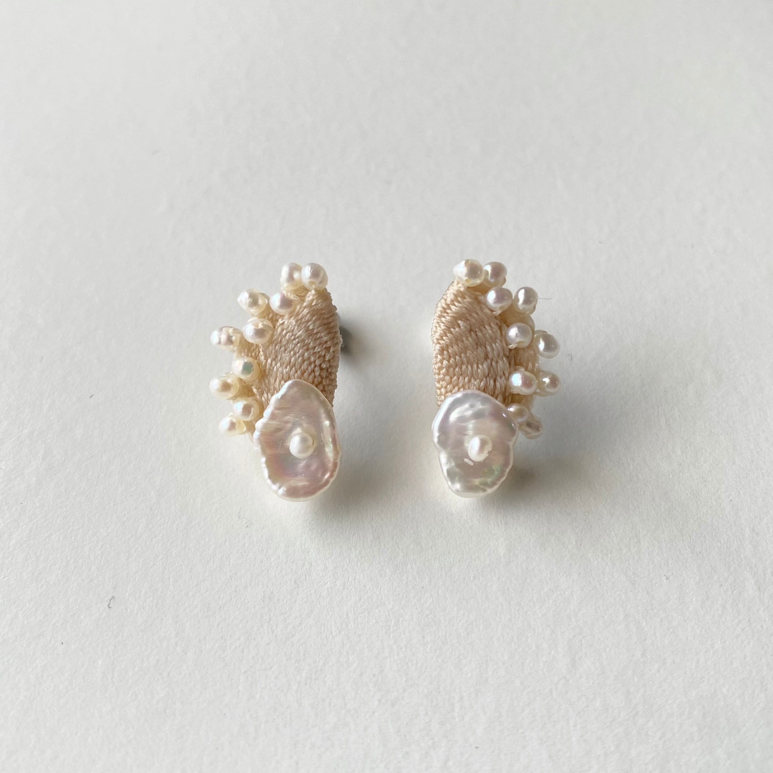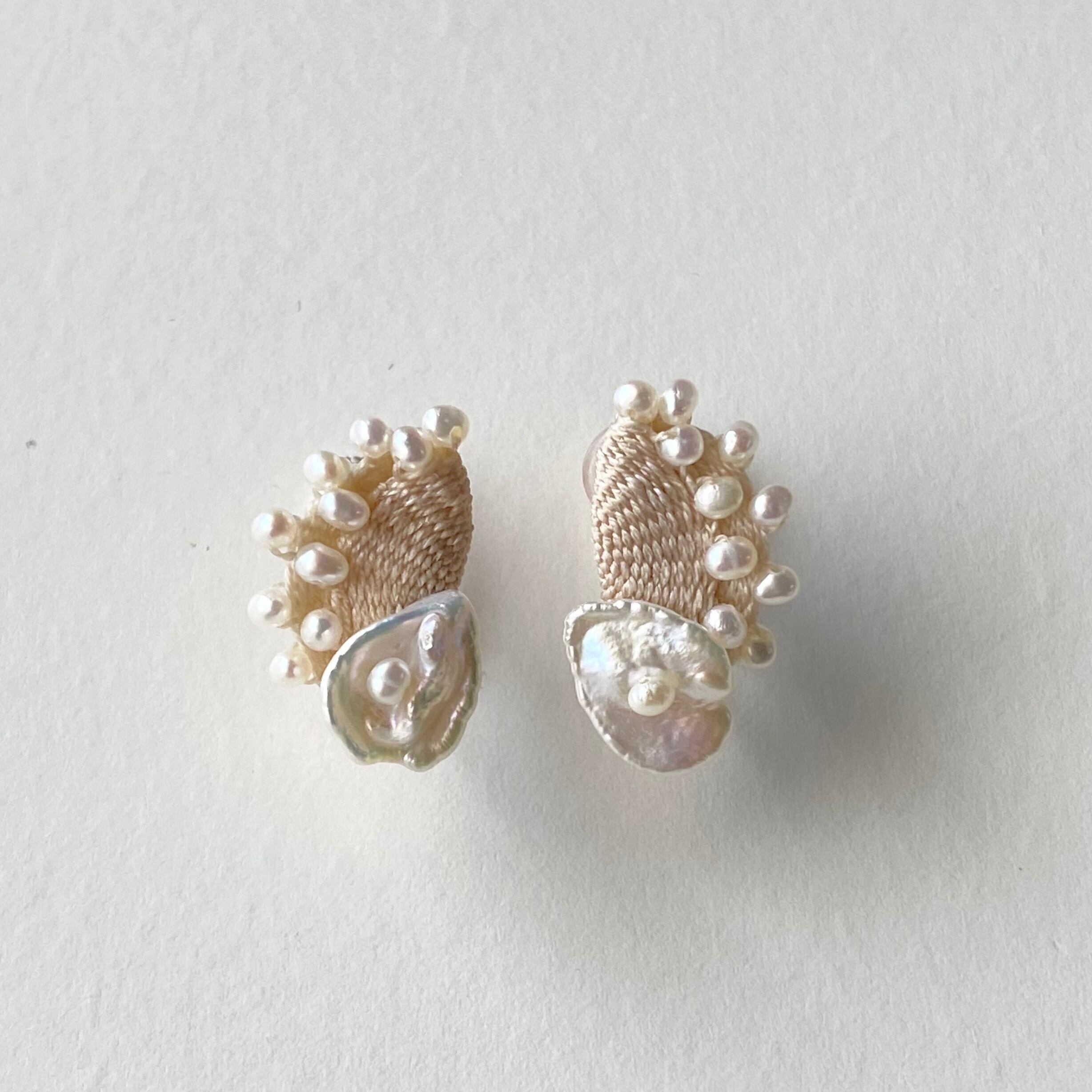 絹糸と淡水パールを織り込んだピアスは柔らかなクリームカラーで肌馴染みの良く優しく品のある雰囲気があります。