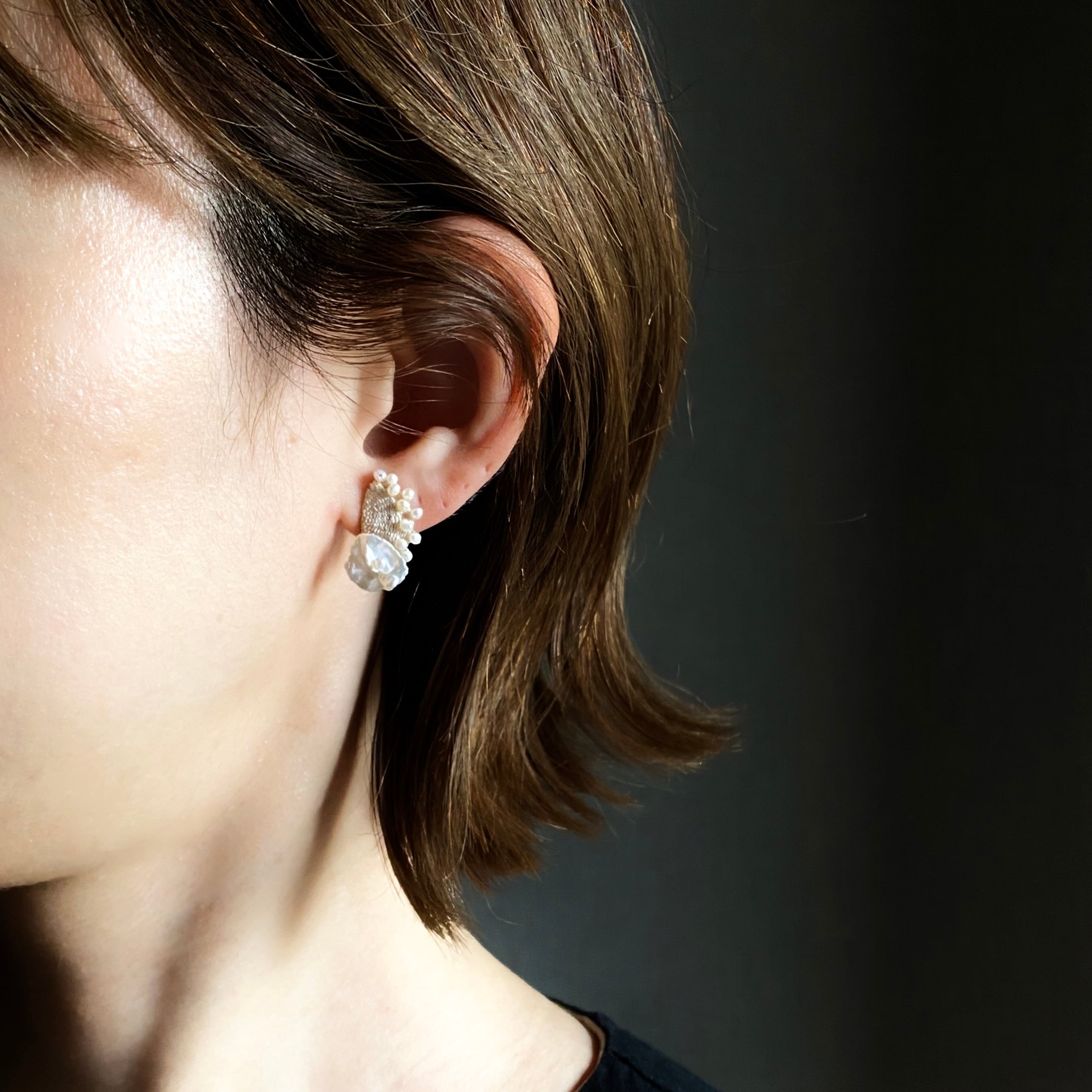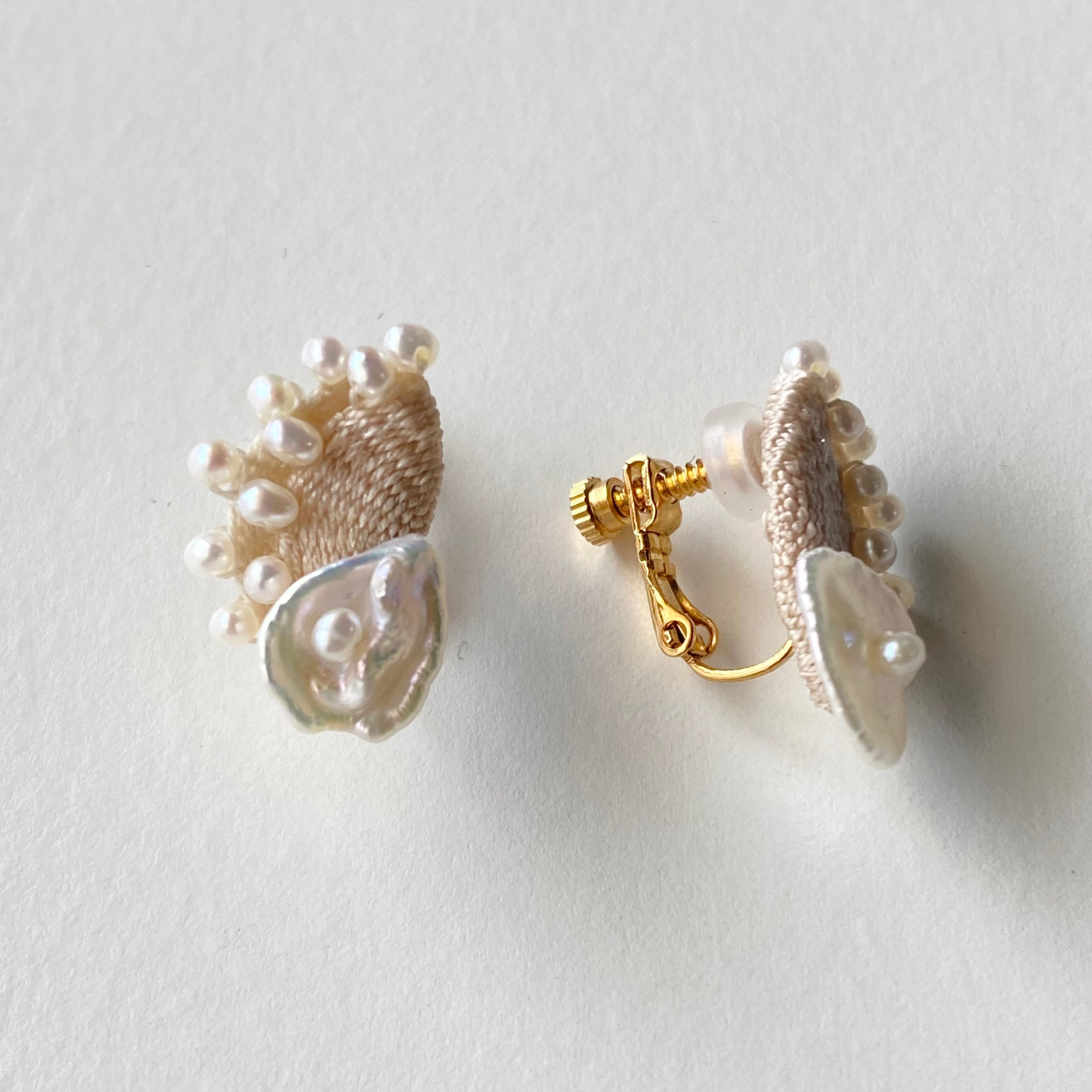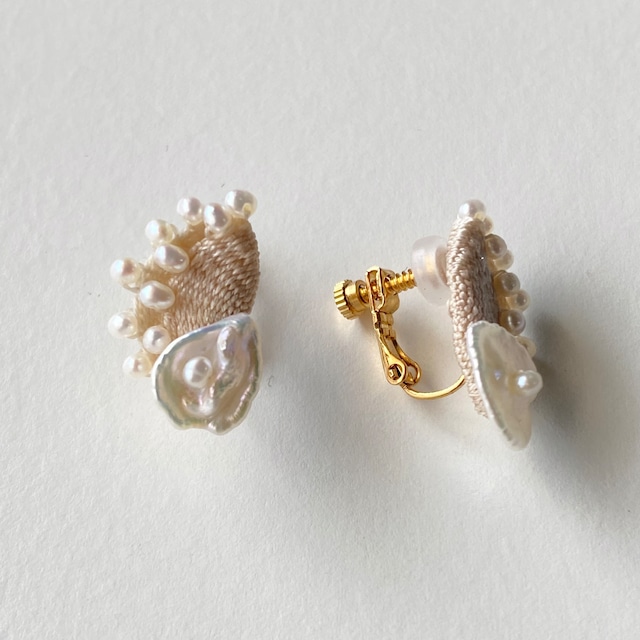 絹糸と淡水パールを織り込んだピアスは柔らかなクリームカラーで肌馴染みの良く優しく品のある雰囲気があります。